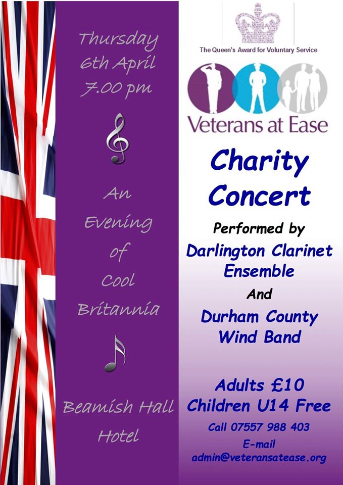 We are delighted to be performing a Proms style evening at Beamish Hall Hotel, DH2 1EH with the Durham County Wind Band. The evening is to raise funds for Veterans at Ease, a Durham-based charity who do fantastic work supporting veterans and those suffering with PTSD.