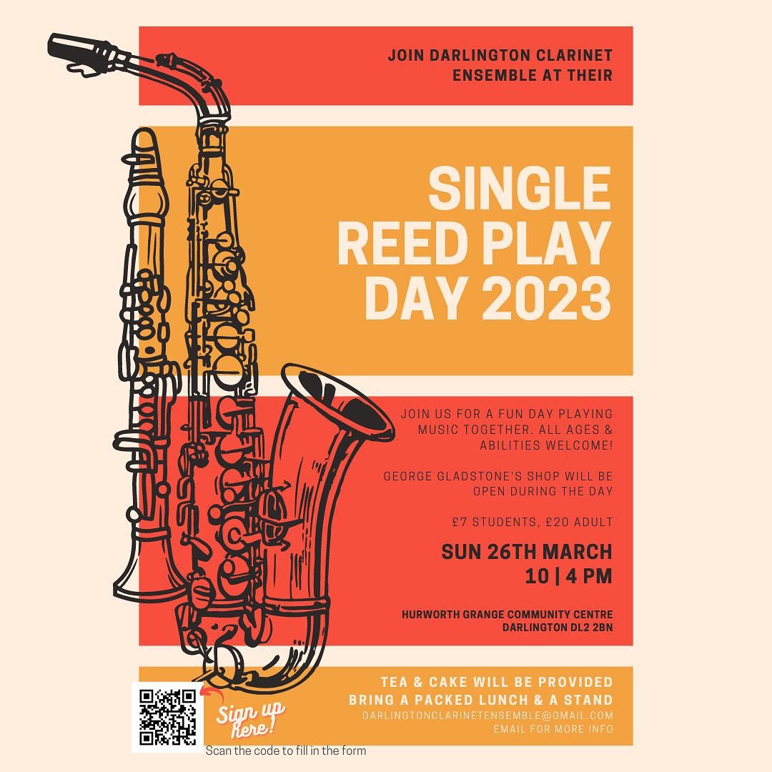 Join us for a day of playing, technique workshops, composition workshops, for all ages and all abilities! Bring an instrument (saxophone or clarinet or both, and any range you like) and a music stand. Sunday, 26 March 2023 at 10:00 at Hurworth Grange